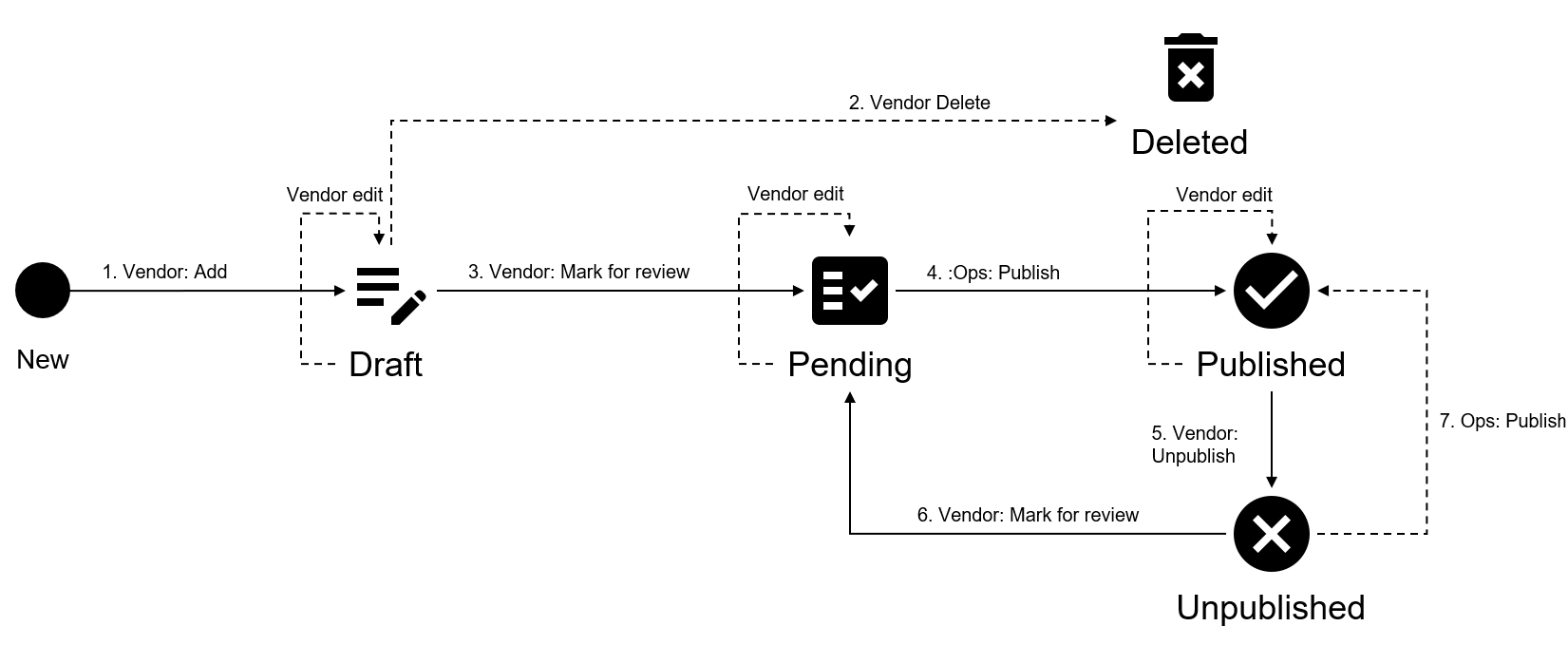 The following diagram shows the possible states for the documentation object in the Marketplace Platform and the transition between these states: