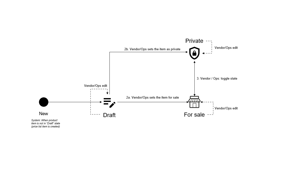 The following diagram shows the possible states for the Pricelist Item object and the transition between these states: