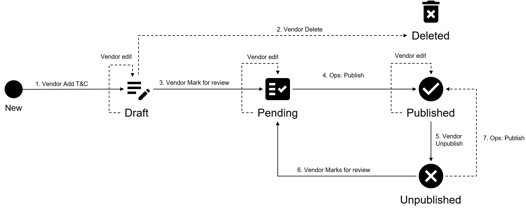 The following diagram shows the possible states for the terms and conditions object in the Marketplace Platform and the transition between these states: