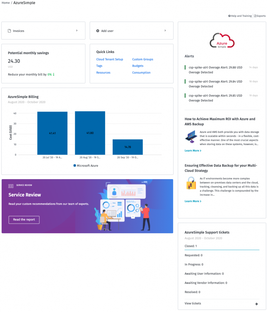 The AzureSimple dashboard provides an overview for clients using SoftwareOne’s AzureSimple service.