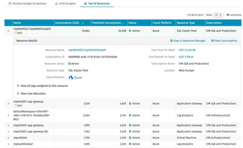 Top 50 Resources - Displays a list of the top resources consuming the most for that budget (Account or Subscription). You can expand the selected resource to view more details and navigate to the Resource page or the Consumption Details page in Consumption Overview.