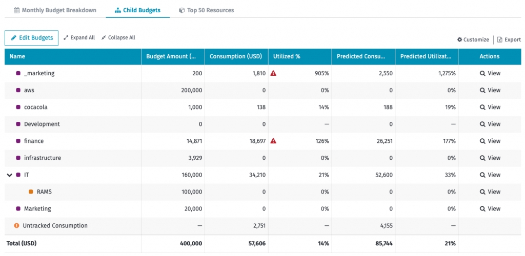 Consumption in child budgets is included in the parent budget utilization value. You can edit the child budget amounts by selecting Edit Budgets.