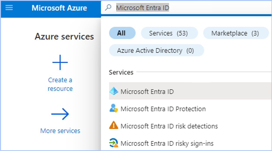Open Microsoft Entra ID. You can use the Azure search bar to find Microsoft Entra ID.