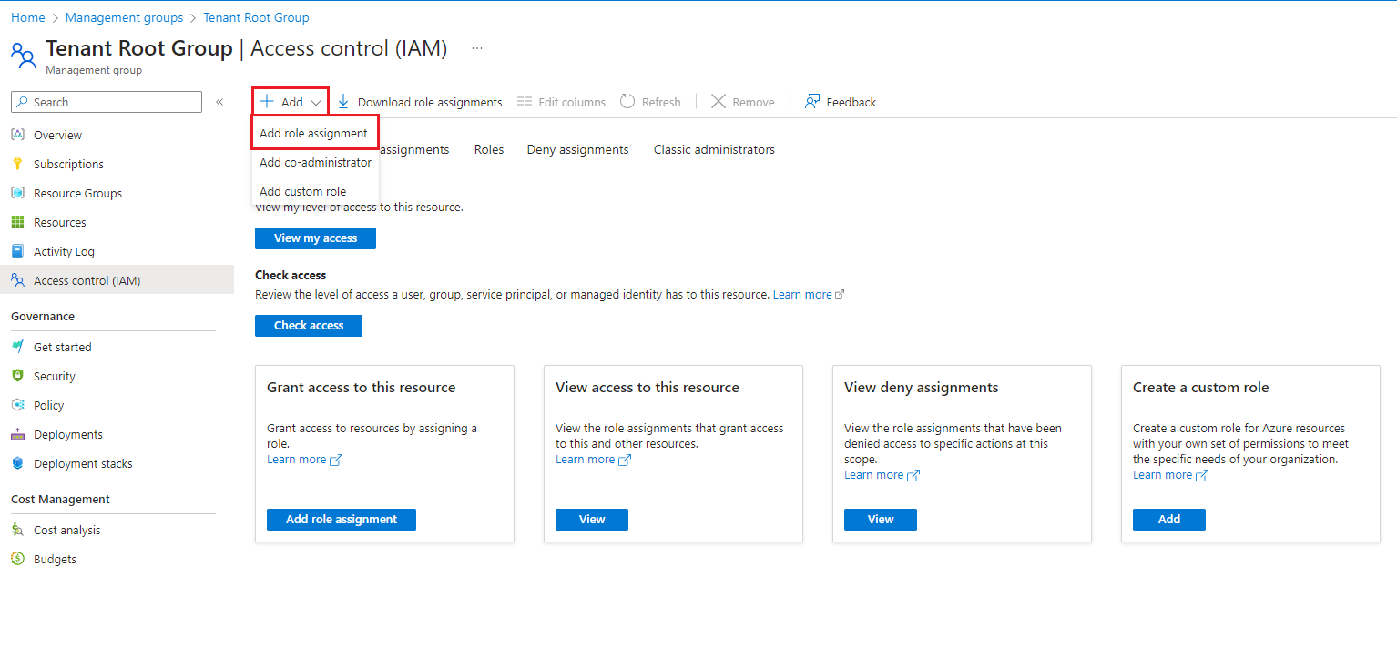 2. Select **Add** > **Add role assignment**. The Add role assignment page opens.