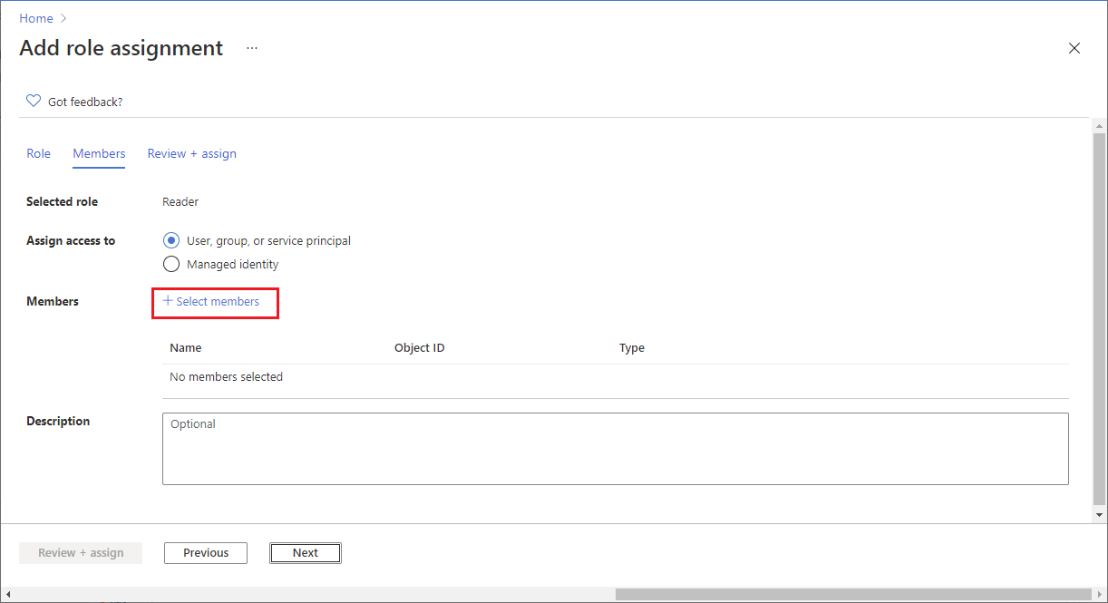 2. On the **Members** tab, select **User, group, or service principal** if it's not selected by default. Then, choose **Select members**. &#x20;