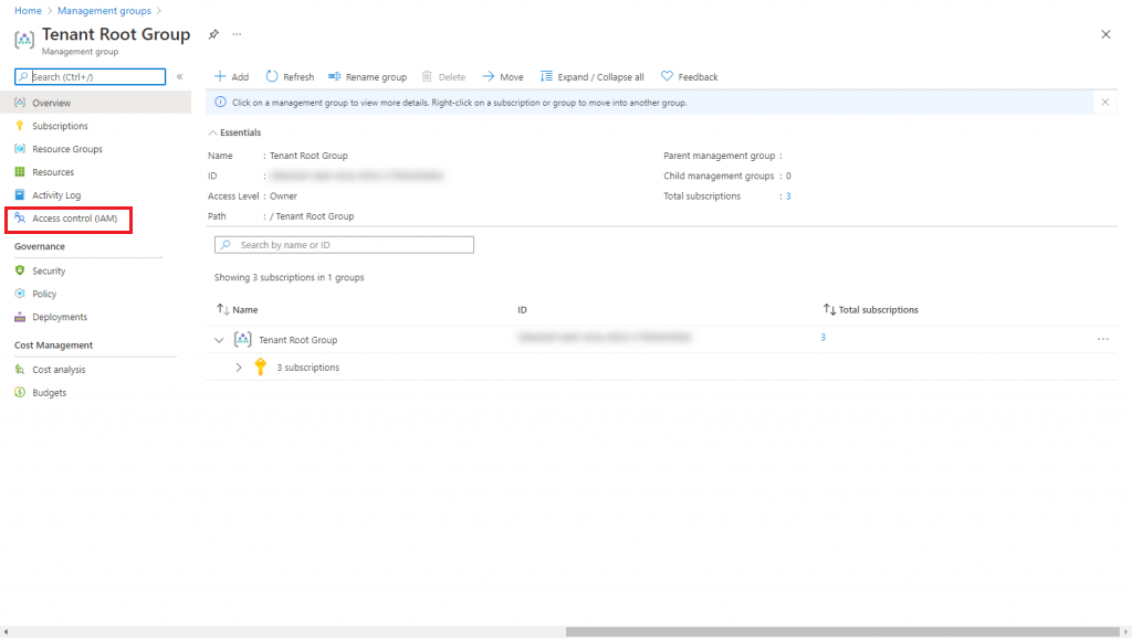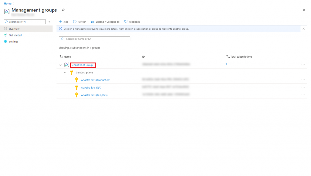 2. On the **Management groups** page, select **Tenant Root Group**. Note that regardless of your organization's configuration, you'll always have a Tenant Root Group. It might have been renamed, but it always appears at the top of the hierarchy.