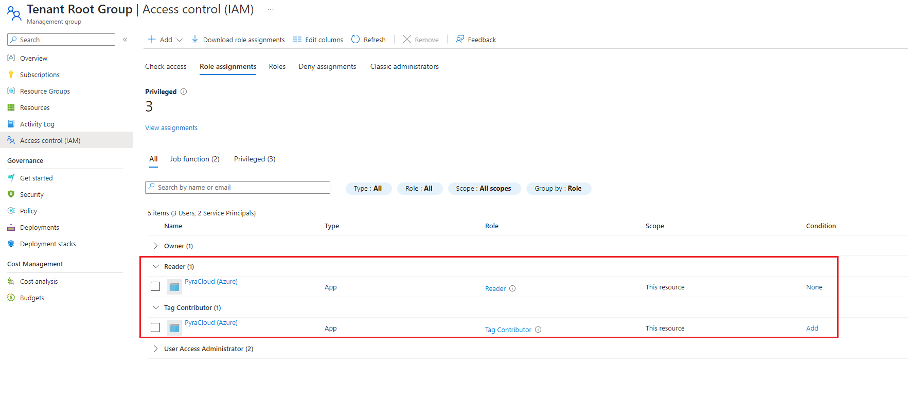 When you onboard your tenant to the Client Portal, an Enterprise Application called SoftwareOne Cloud Consumption (formerly PyraCloud) is created in your tenant. You must then assign the [Tag Contributor](https://learn.microsoft.com/en-us/azure/role-based-access-control/built-in-roles#tag-contributor) and [Reader](https://learn.microsoft.com/en-us/azure/role-based-access-control/built-in-roles#reader) roles to the "PyraCloud (Azure)" Enterprise Application: