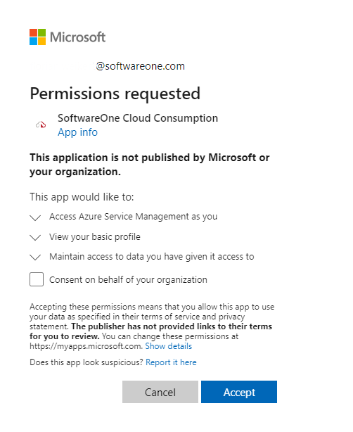 During the consent flow, the SoftwareOne Cloud Consumption app is added to the organization tenant. This enterprise application is granted the EA Reader permission, which allows us to read the consumption data. To add the application to the tenant, you'll need permission to approve an Enterprise Application.