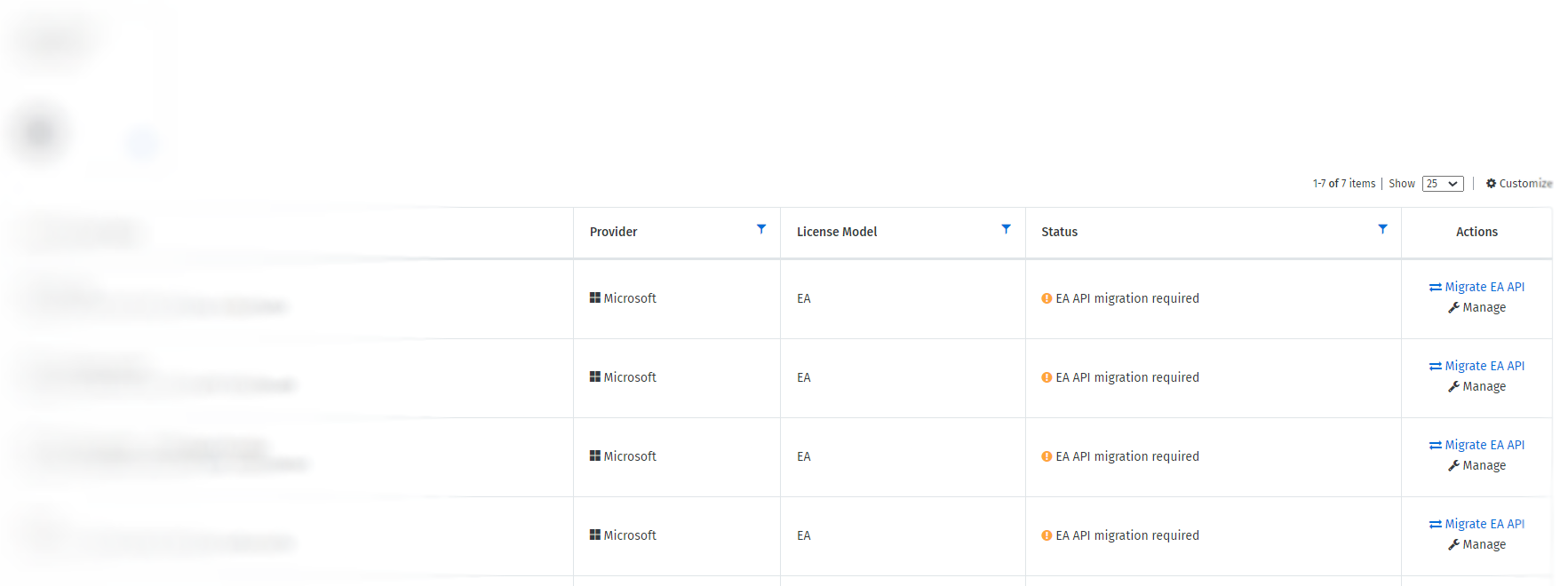 On the Cloud Tenant Setup page, locate the required EA cloud account with the status EA API Migration required.