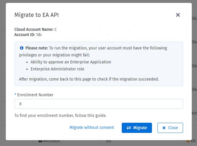 In the Migrate to EA API window, enter the enrollment number, then select Migrate without consent.