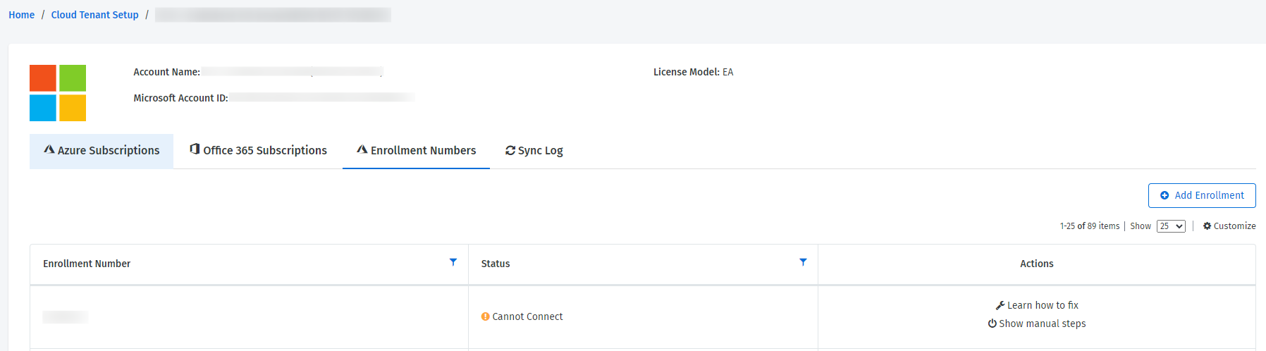 The Enrollment Numbers tab on the details page of the cloud tenant displays the enrollment numbers that are migrated to the new API, along with the respective enrollment status: