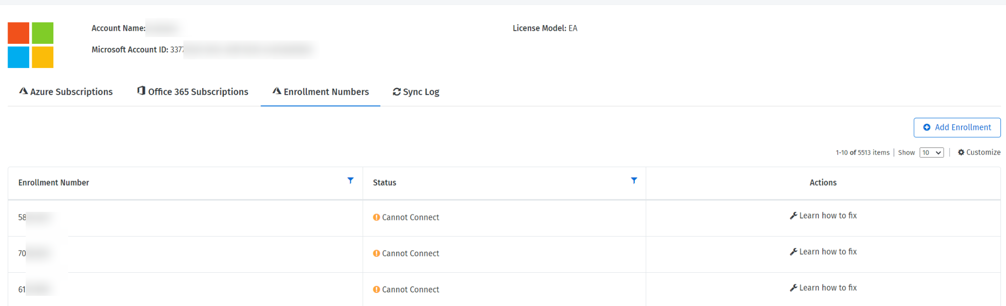 On the Enrollment Numbers tab, you can view all enrollment numbers that are migrated to the new API, along with the enrollment status. For possible statuses and their description, see Enrollment statuses.
