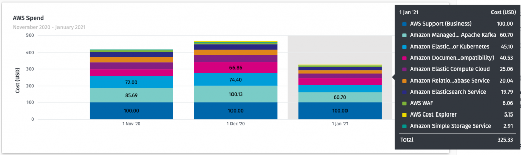 Displays your spending information from the last 3 months. You can view more details and get a breakdown of your spending if you hover over one of the columns in the chart. Clicking the section opens up the Consumption report where you can see more details, and use filters to narrow down your results.