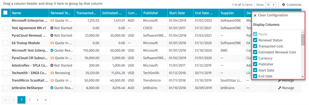 See a list of all agreements including customization functions