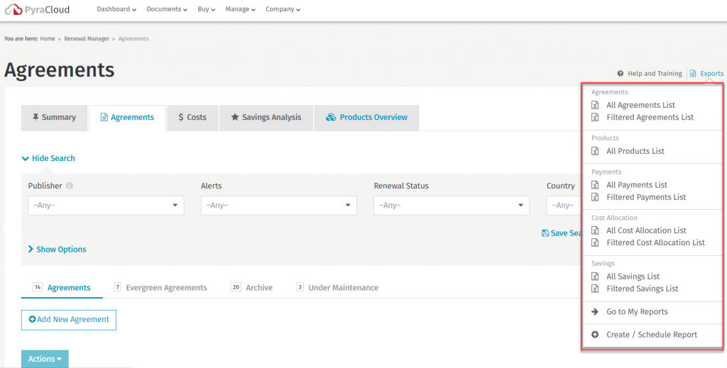The main navigation allows you to easily navigate to different areas in Renewal Manager such as Summary, Agreements, Costs, Saving Analysis, and Products Overview.