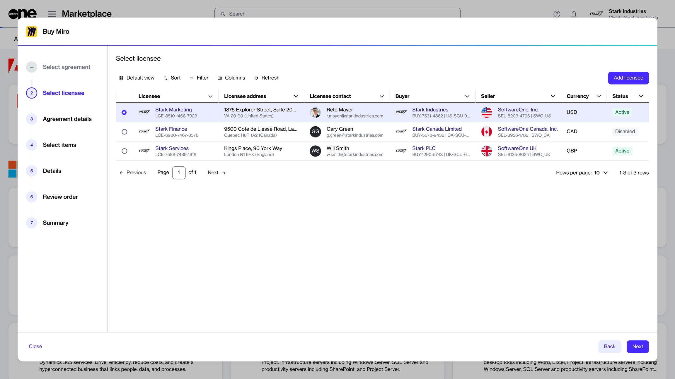 Each step of the purchase wizard provides you with different options you can use to order subscriptions. The steps include some common steps that apply to each vendor and product, and some dynamic steps that are vendor-specific. Note that you cannot use step numbers to navigate between different pages of the wizard. Navigation is possible using the Close, Back, and Next options only.