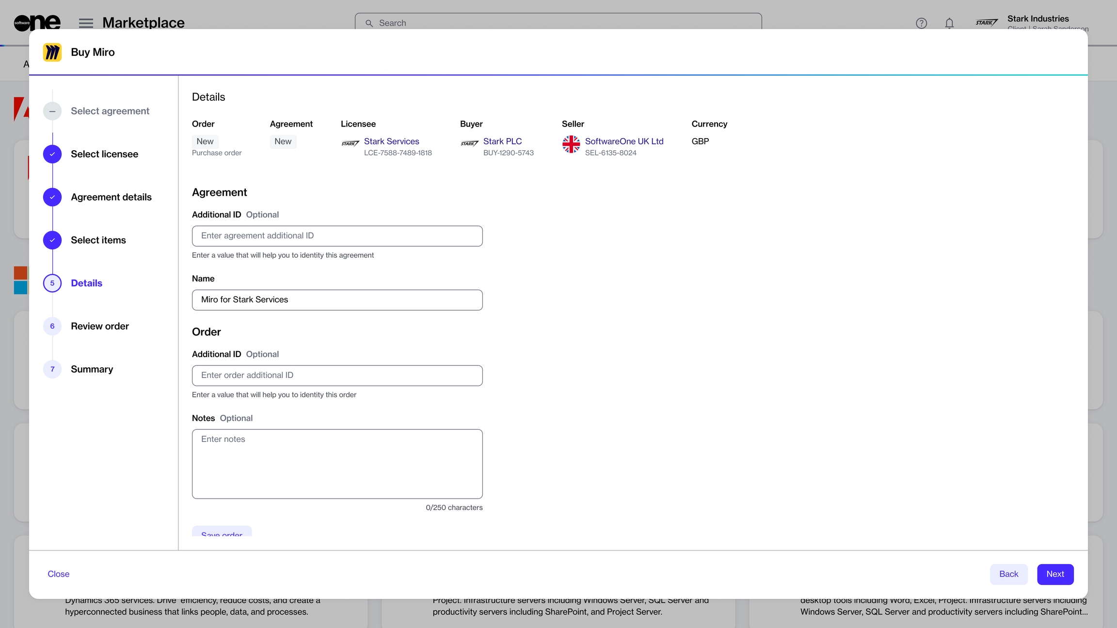 The purchase wizard also lets you enter additional IDs associated with your purchase. For example, in the Details step, you can enter a purchase order number in the Agreement Additional ID field. This number will then be displayed on your invoice. Additionally, you have the option to save your order as a draft order and complete it later.
