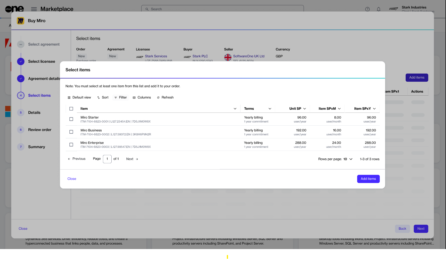If you select an existing agreement instead of creating a new one, you'll immediately see the Select items section, where you can choose the items you wish to order.