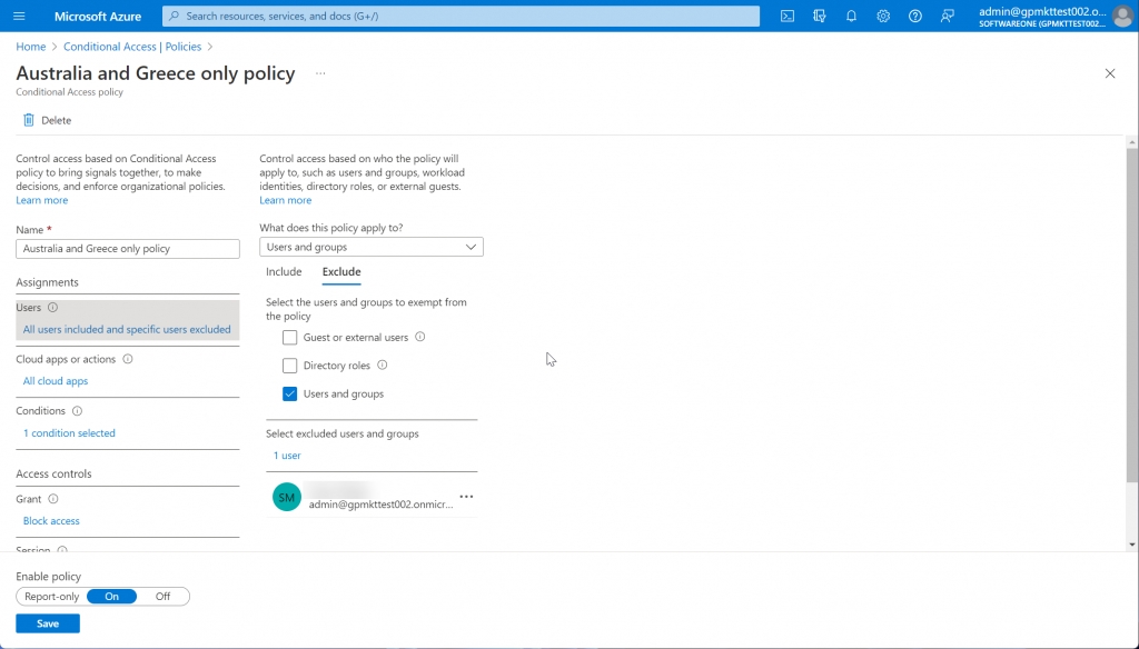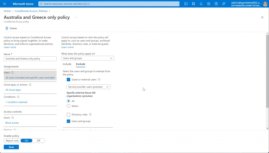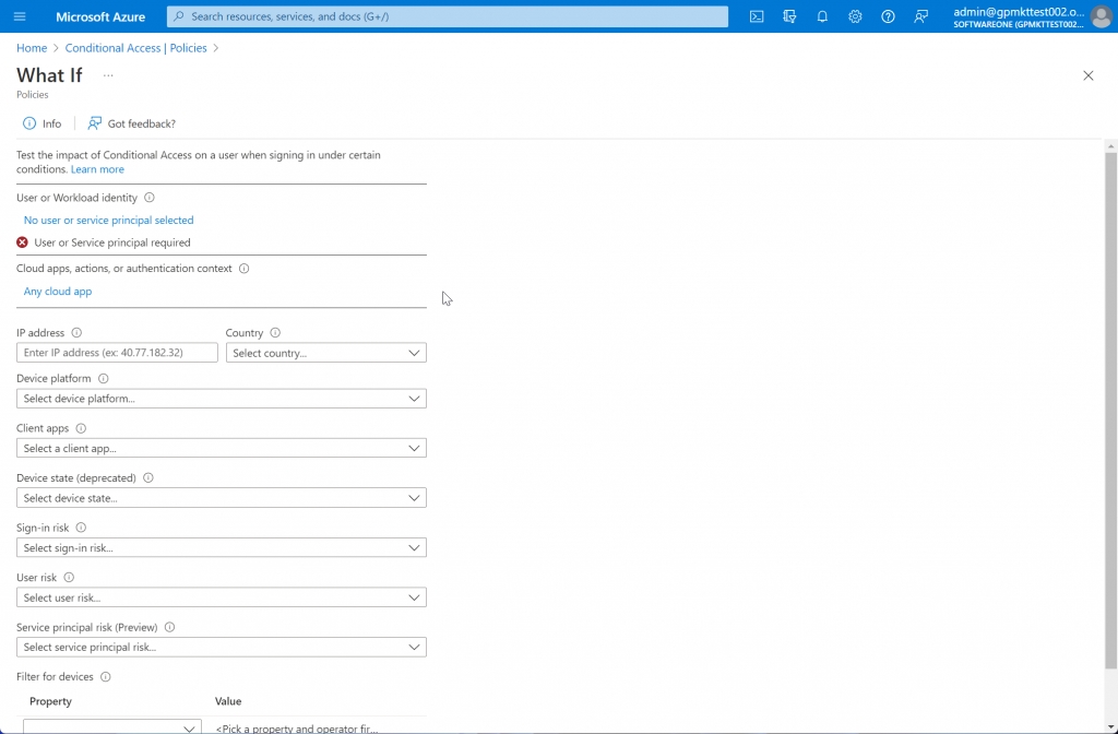 Before you can exclude Client Portal and SoftwareOne from your policies, you need to know exactly which policies are affecting access. You can do this using the What If capability of Conditional Access.