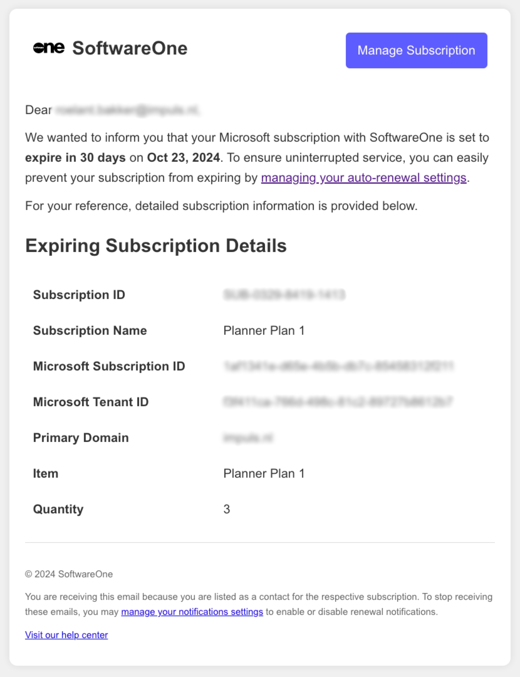 The renewal notifications are sent 1, 7, and 30 days before your subscription ends. The notifications contain the Manage Subscription option, which allows you to enable autorenewal for your subscription. To learn more, see Renewal Management.