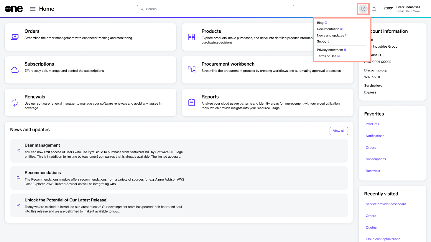 provides access to various resources, including the SoftwareOne blog, product documentation, news and updates, and our legal pages.