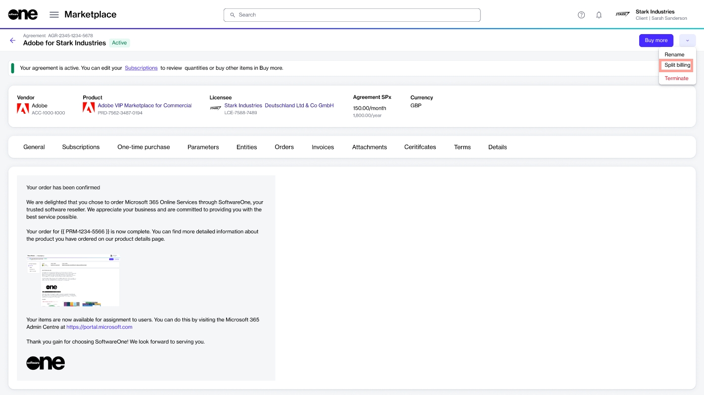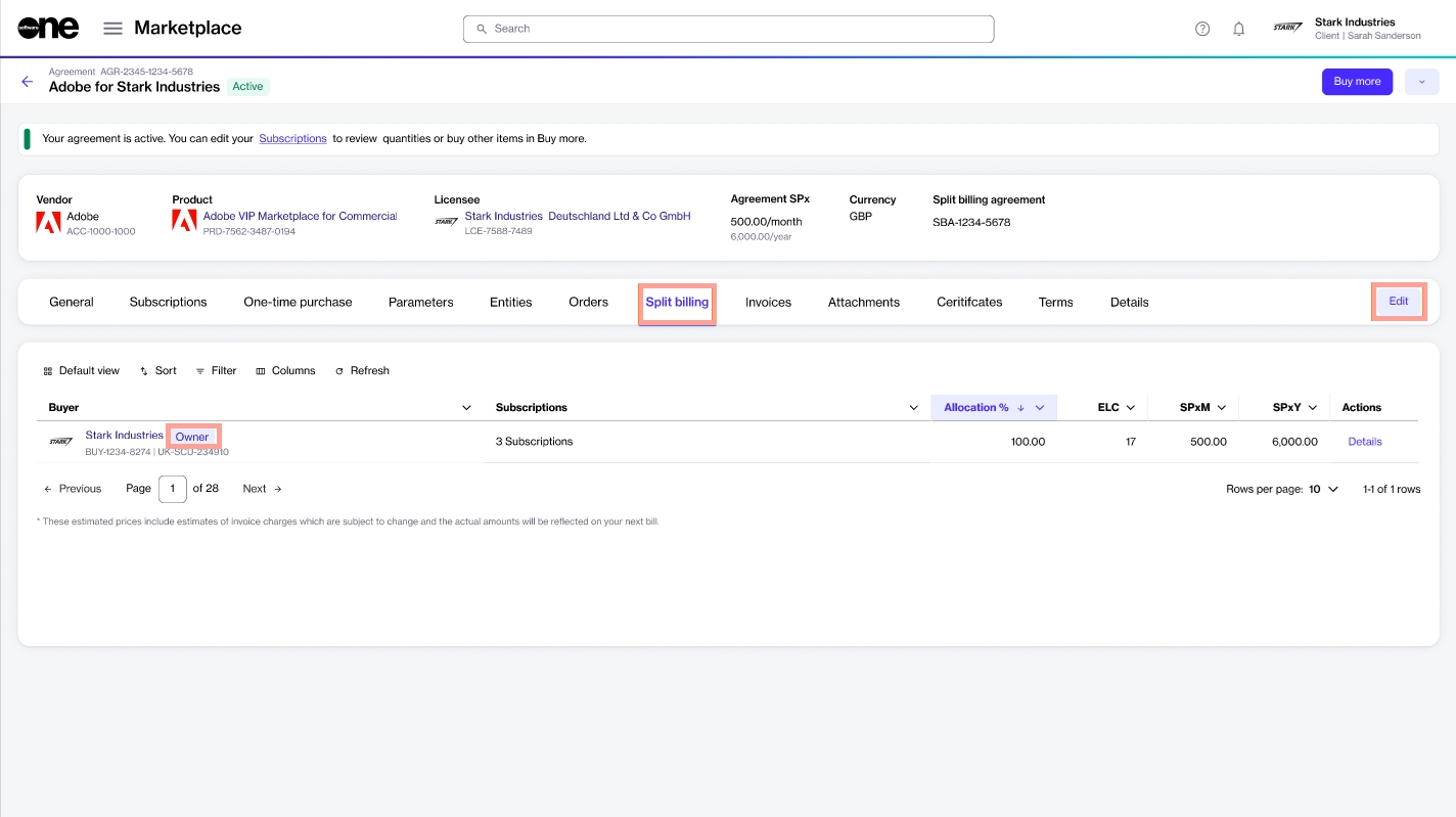 After activating split billing, new purchases under the agreement are invoiced based on the allocation percentage or the specific buyer you've allocated the subscription billing to.