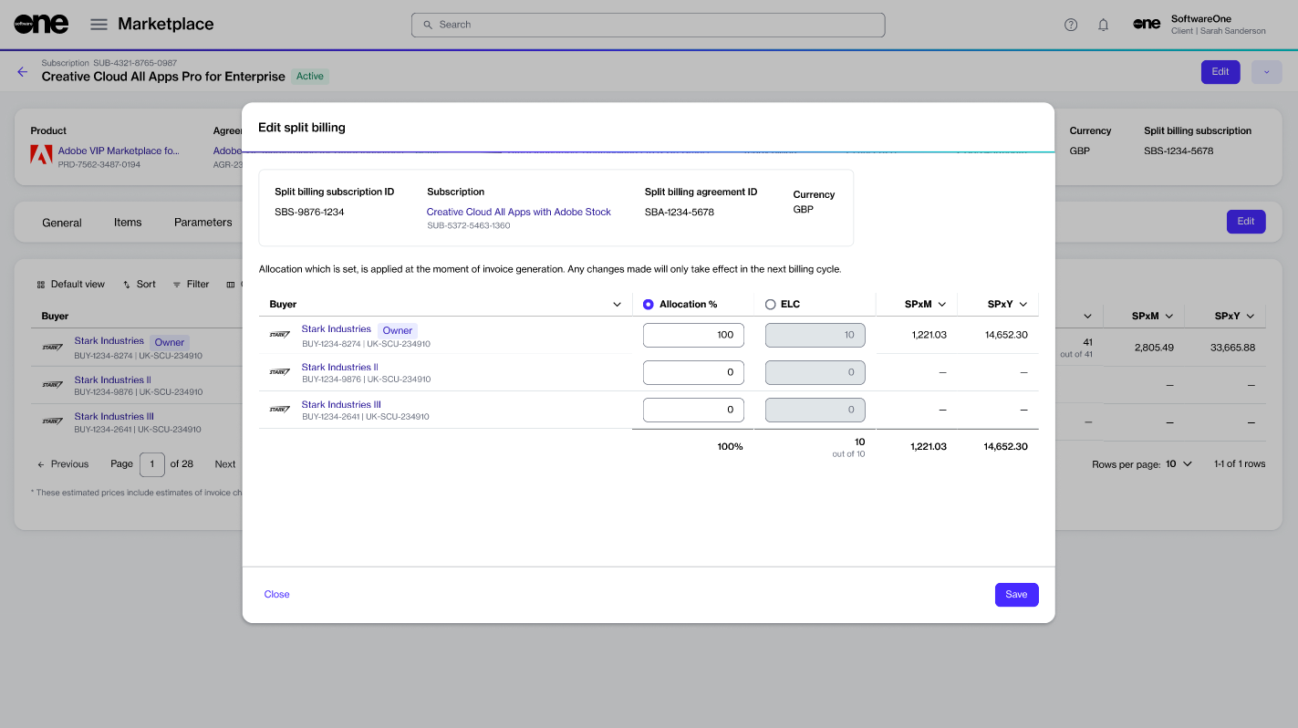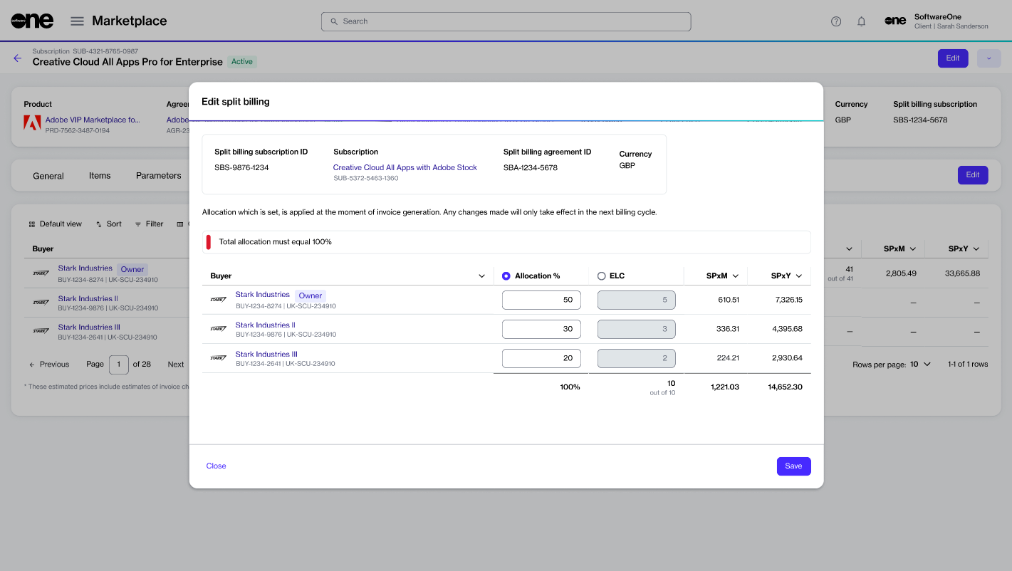 Enter a value based on the split percentage or license count and click Save. Make sure that 100% of billing or all licenses are allocated. Otherwise, the platform displays a message.