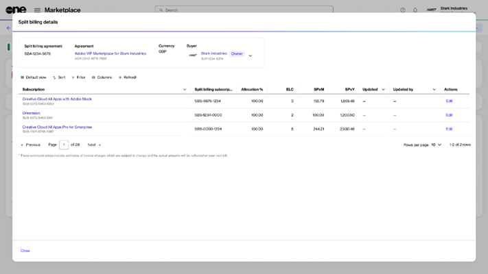 In the Split billing details dialog, select the Edit option corresponding to the required subscription.