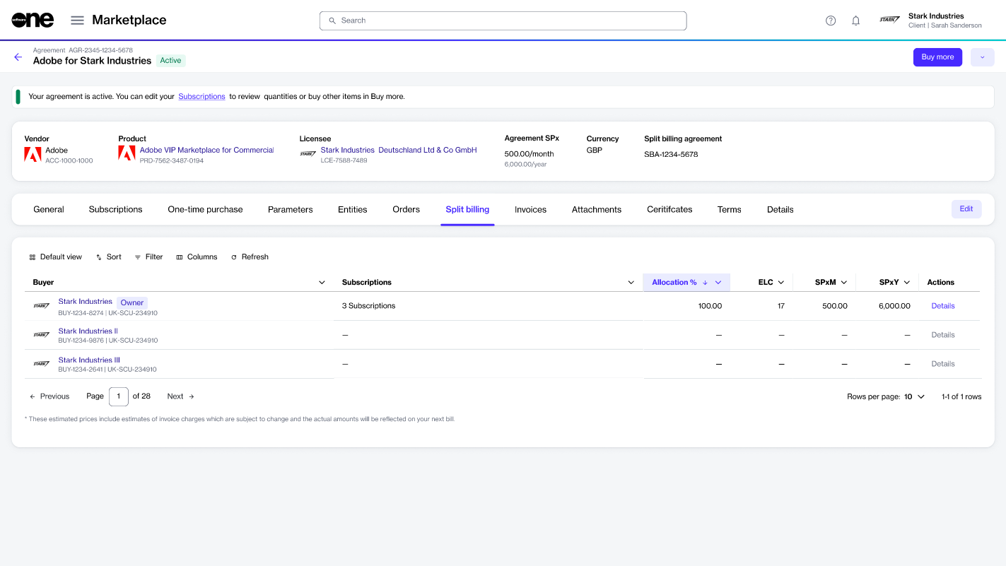 The Split billing tab within the agreement details page displays the allocation for your assigned buyers. Use the Details option for each buyer to adjust the billing percentage or the estimated license count.