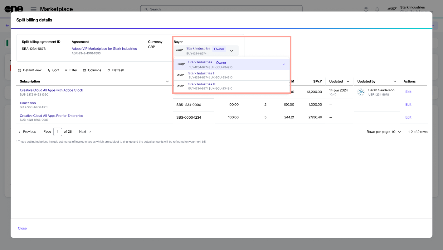 The Split billing tab on the subscription details page displays the allocation for all buyers and allows you to divide the billing across different buyers in your account.