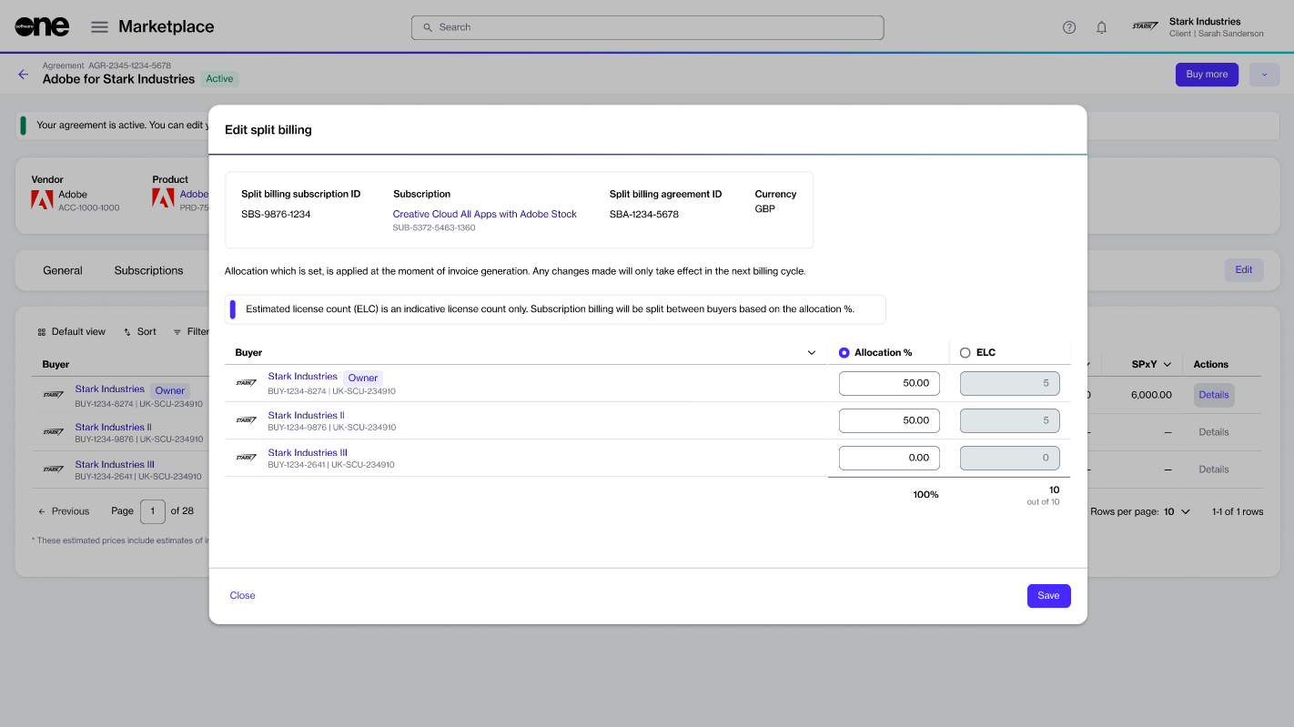 You can update the split to include additional buyers and allocate billing to those buyers. There are two ways to do this. You can configure the allocation from the subscription details page or the agreement details page.
