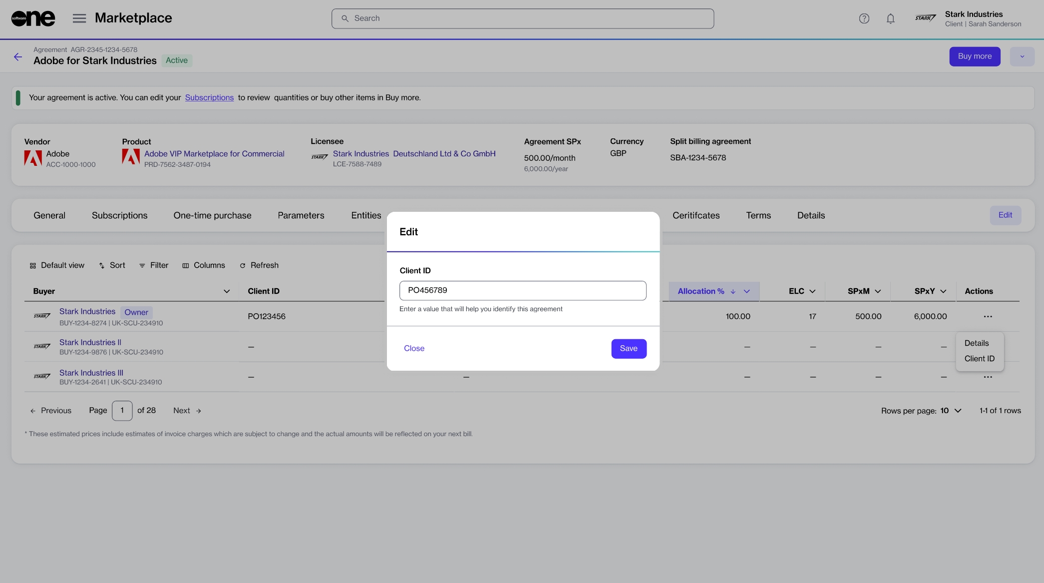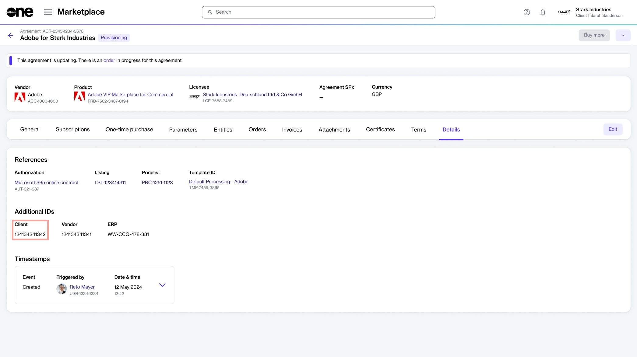 Within the marketplace, the PO number is also displayed as Client ID on the Details tab of the agreement: