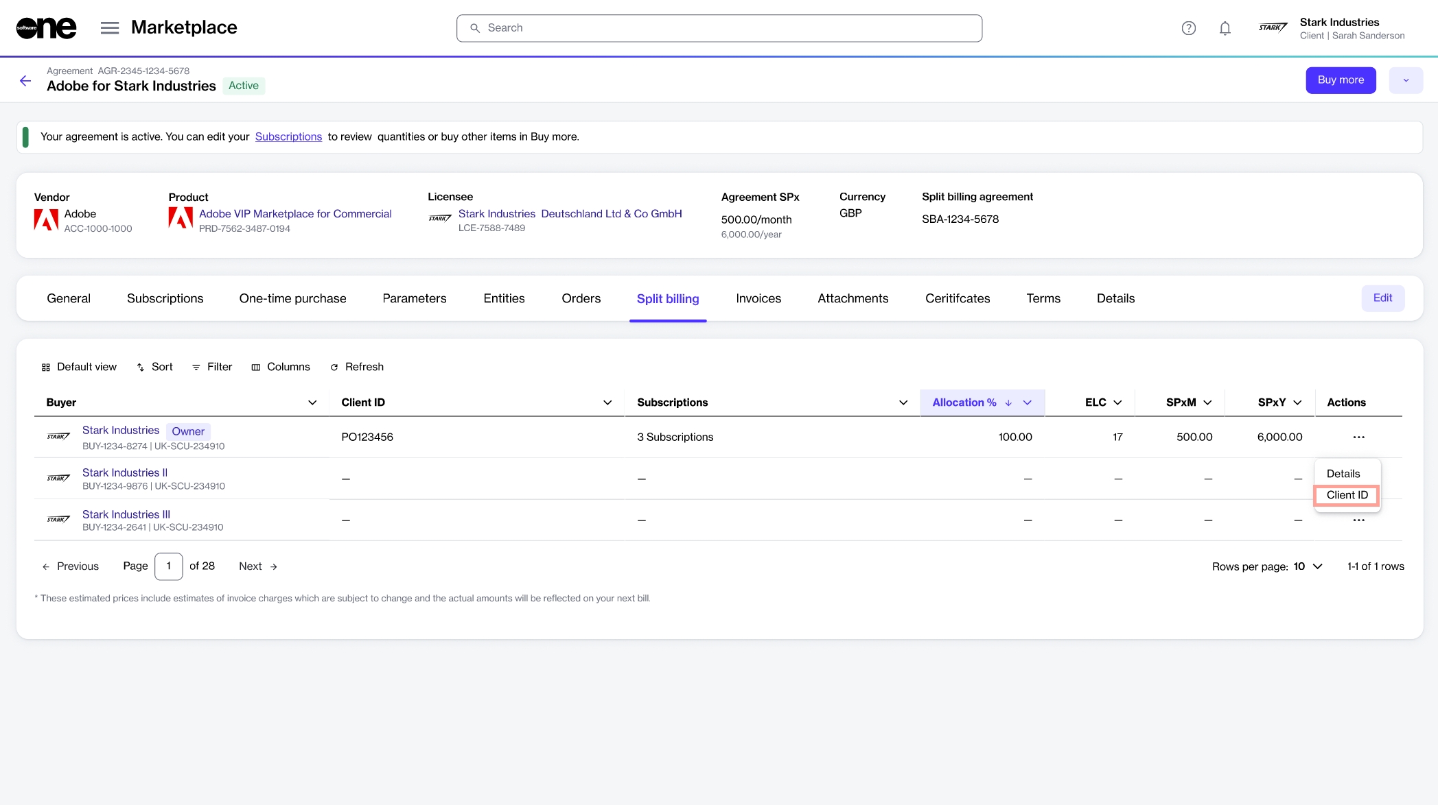 The value is then updated and displayed as Client ID on the Split billing tab. This same value is also included on the buyer's invoice in your next billing cycle.