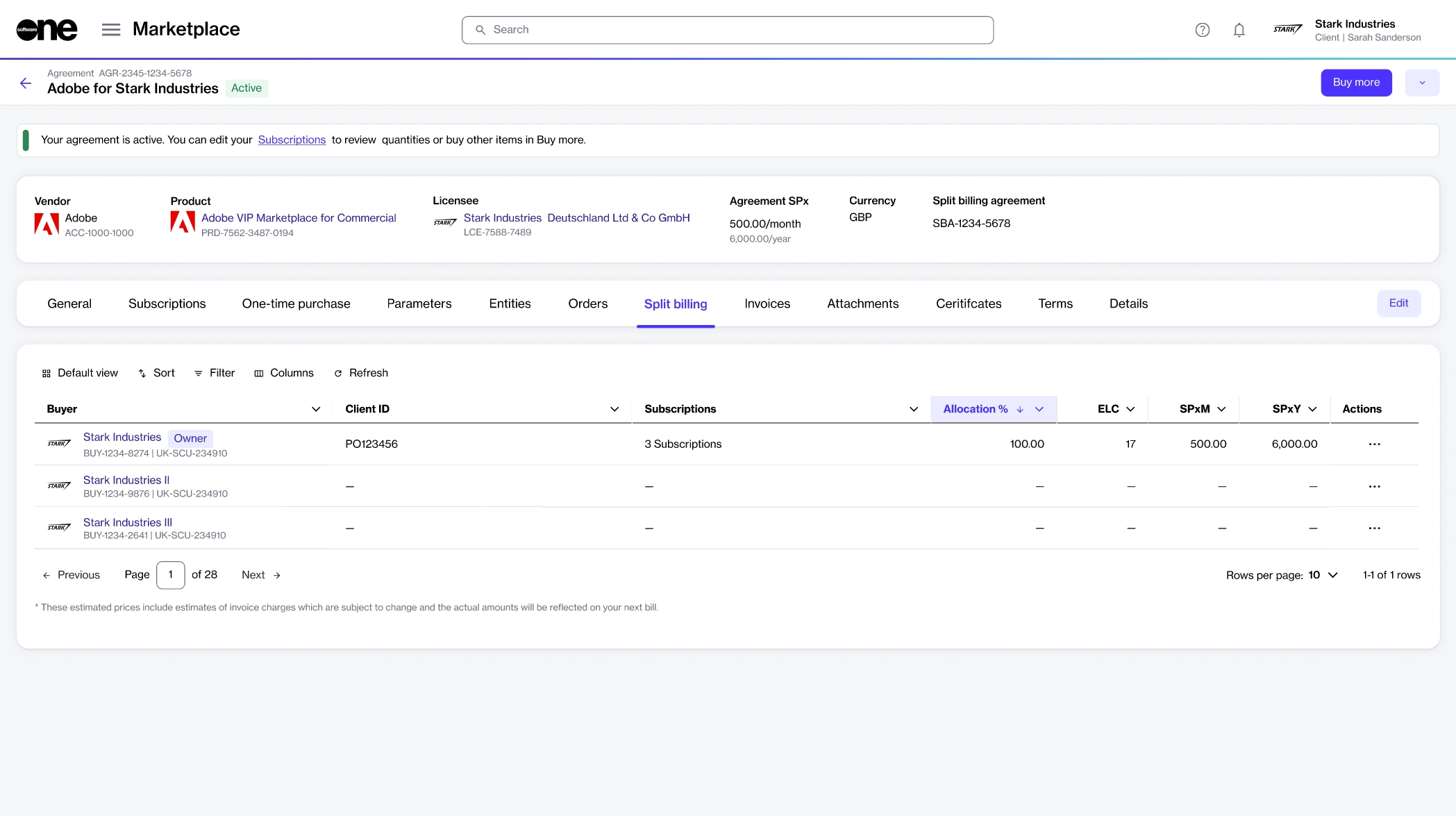 On the agreement details page, select the Split billing tab. The buyers you've configured for the agreement are displayed.