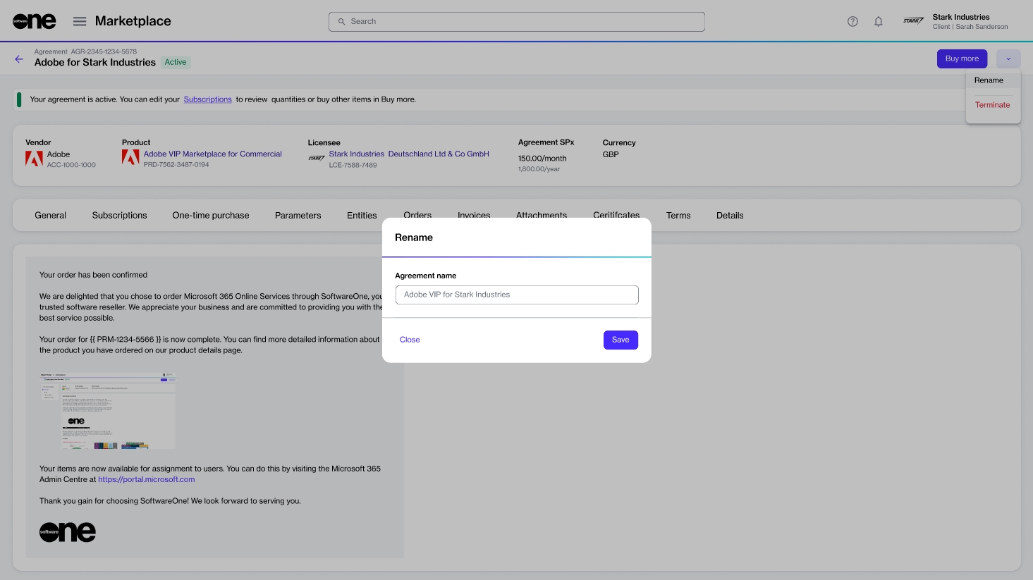 - On the agreement details page, select the arrow - and choose Rename.