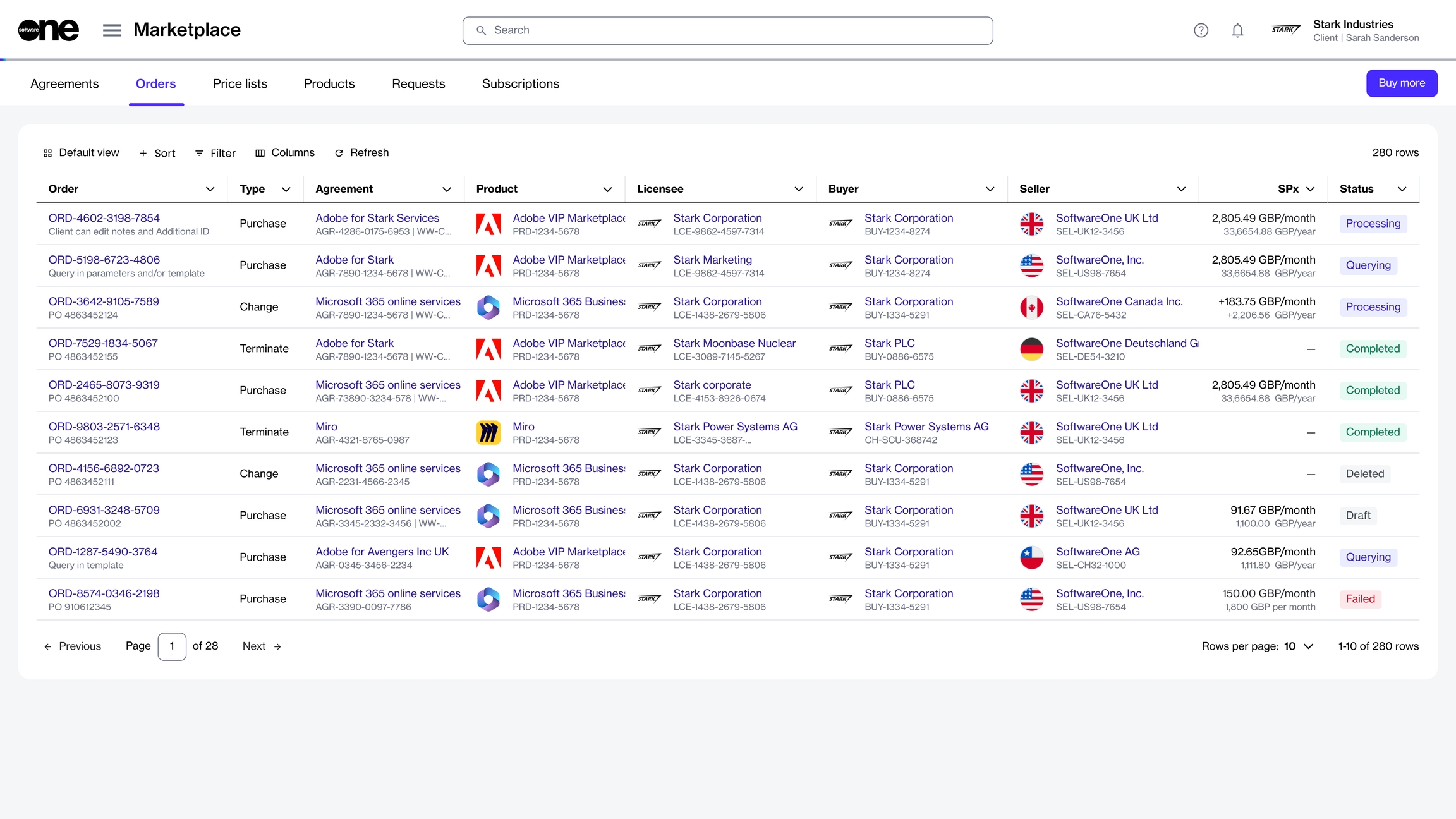 For each order, you can view information, such as the order number, linked agreement, product name, estimated sales price, status, and more. You can use the sorting and filtering options to customize the list and show or hide specific columns as needed.