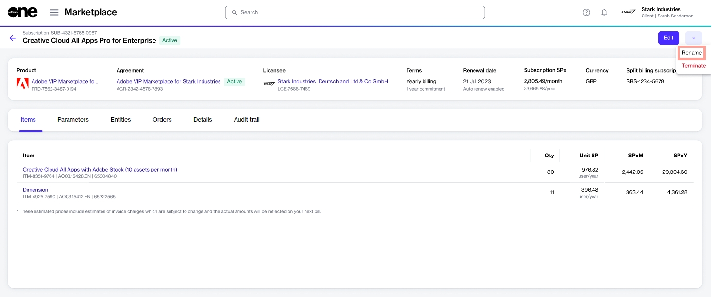 The subscription is renamed, and the new name is visible across all pages that feature the subscription within the platform.