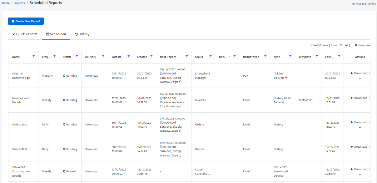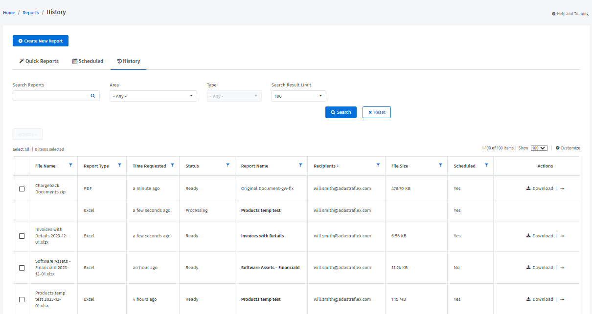 You can trigger scheduled reports at any time. After a report is generated, it downloads automatically and is available on the History tab. To run a report, select Download in the Actions column.