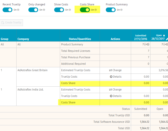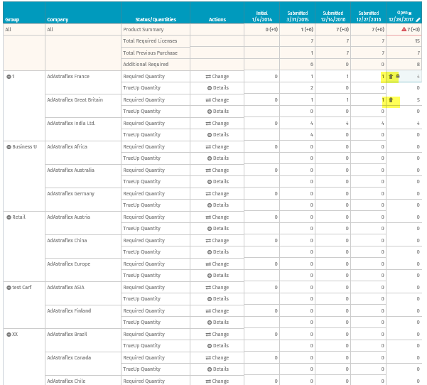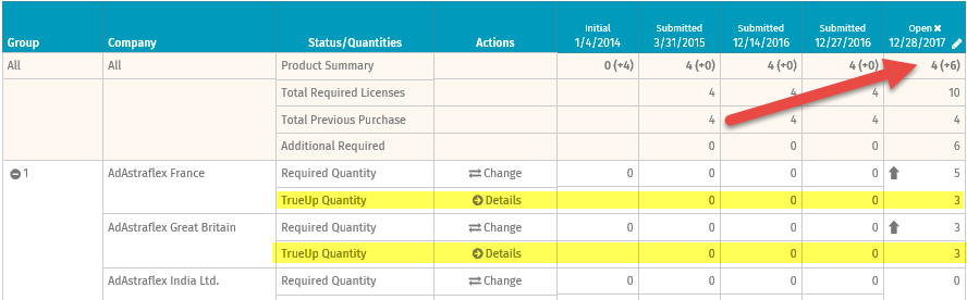Here the Admin can decide which location is appropriate to buy these additional licenses based on tax rates and other factors. The Admin can then add license quantity accordingly against “TrueUp Quantity” for those locations.