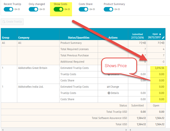 Enabling this filter will show the license cost instead of license quantities. If this is set to “Off”, the page will show the license quantities as shown below.