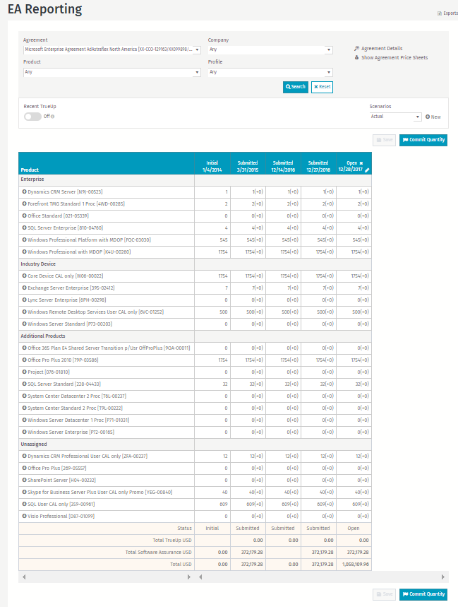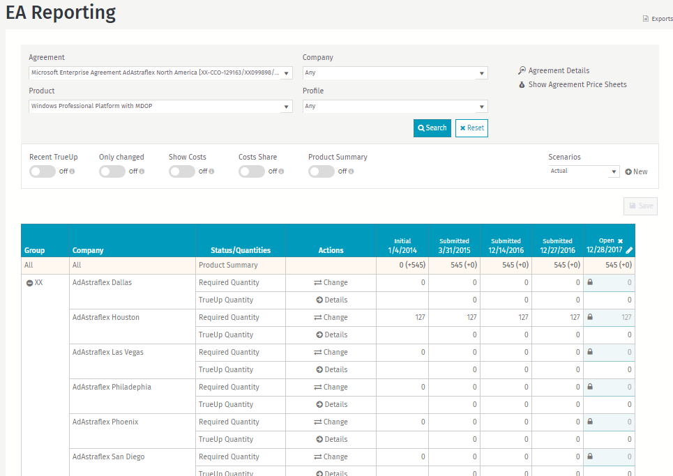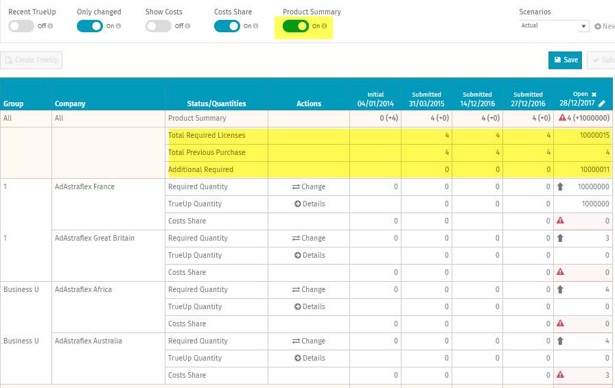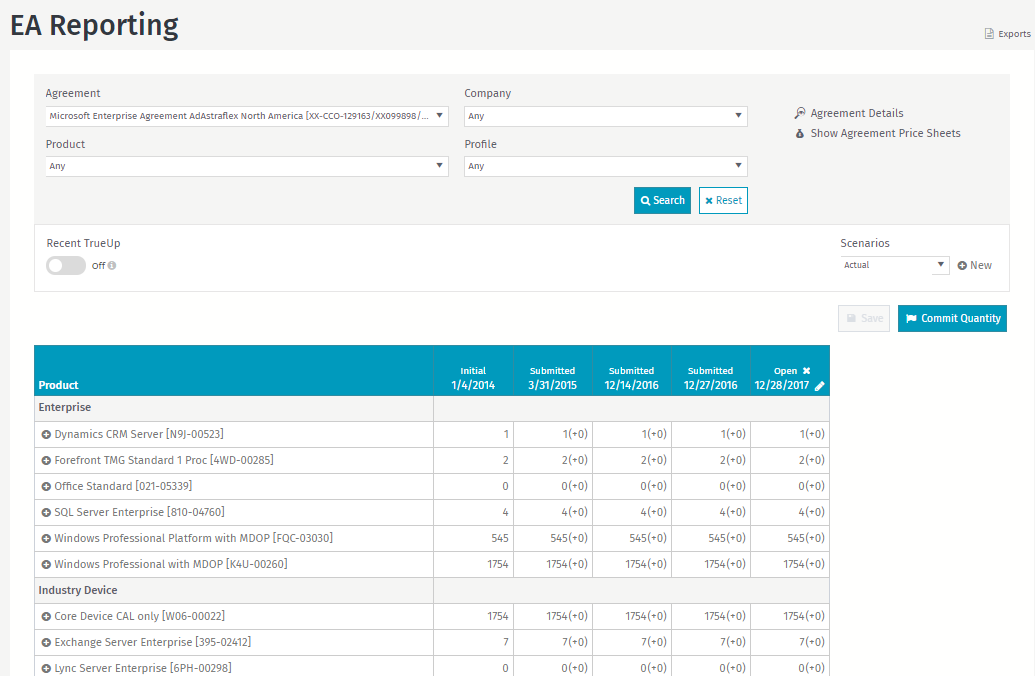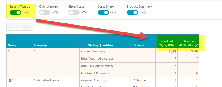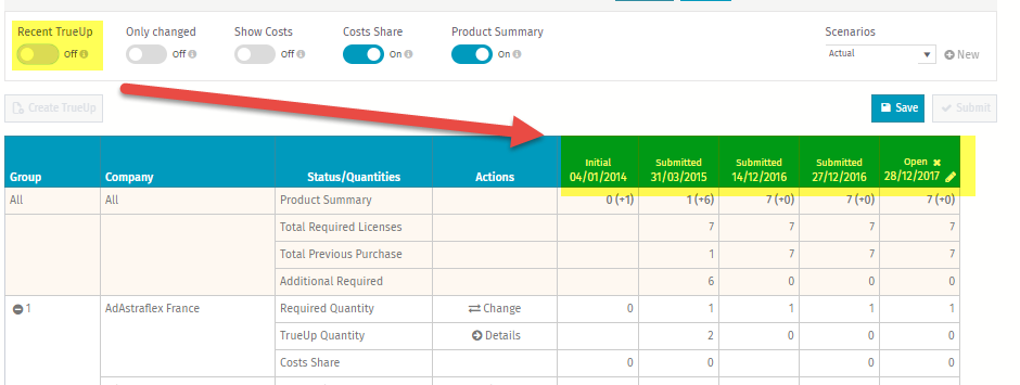 It reduces the number of results in the data grid i.e. if “Recent TrueUp” it is enabled, then the user will only see data for the most recently opened and last submitted EA TrueUp as shown in Figure 2 below.