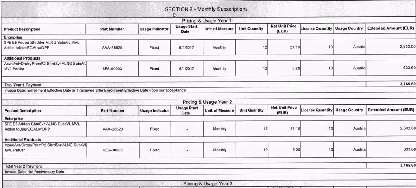 Data required in this step can be found in CPS table under the header “Section 2 – Monthly Subscriptions” as shown below. There are a few columns in CPS that you do not have to take into consideration from now on: “Usage indicator”, “Usage Start Date” and “Unit of Measure”. Those columns should be omitted when inputting pricing information.