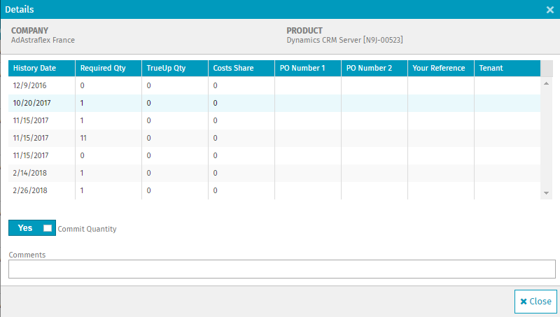 The “Details” option displays the history of the given report entity i.e. when a number of licenses have been changed within a given location. Additionally, it allows users to commit the current value set in the required quantity, with comments, which will be visible to the admin.