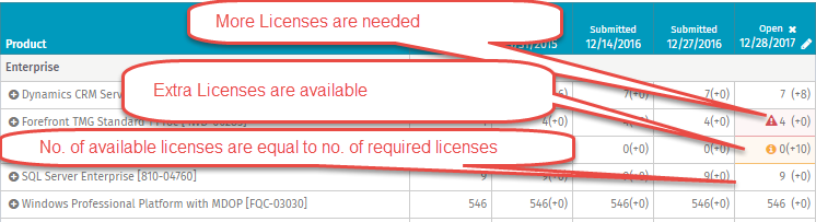 Indicators help Admins to understand the reporting status. When an Admin hovers over a value, an indicator will pop up telling the Admin what the color code is referring to i.e. if any extra licenses are available or extra licenses are required, etc.