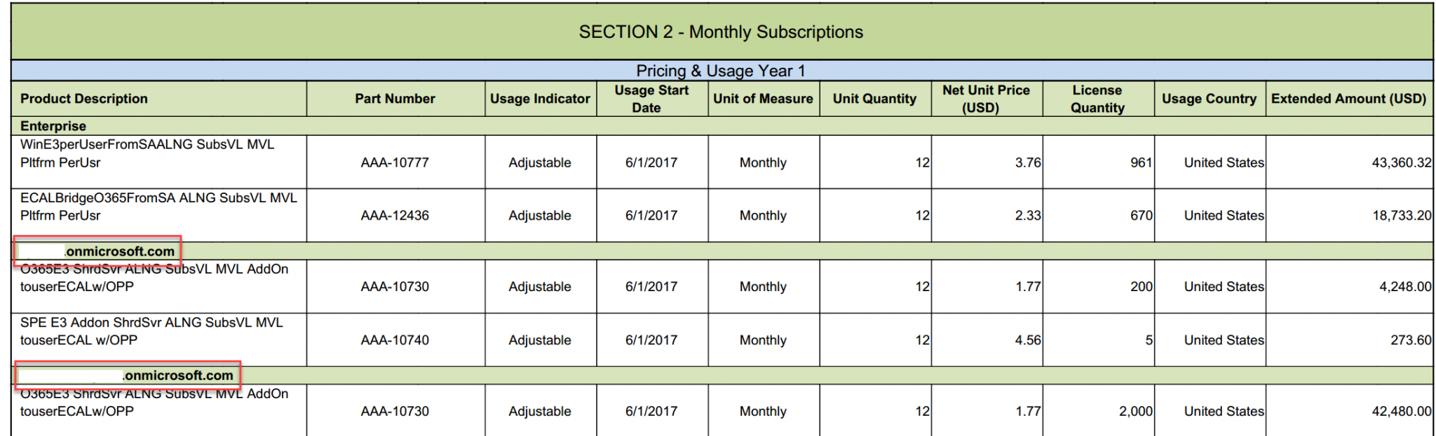 Tenants represent the domain of subscription products. They can be found in “SECTION 2: Monthly Subscriptions” as well as the proper “Future Pricing” subsection. The screenshot below shows two tenants have been identified. Subsections should not be treated as tenants and will be automatically added by default.