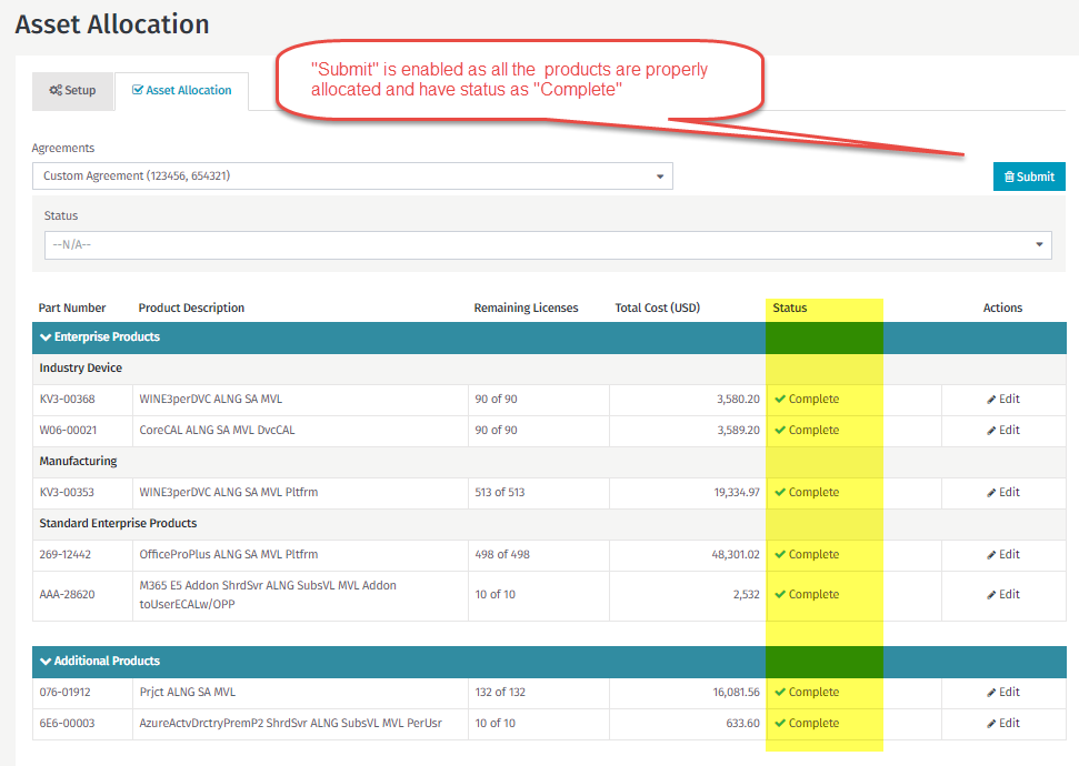 Submit: Used to submit the EA reporting. Once the reporting is completed by the EA Admin, they can submit the report by using the “Submit” button. Users do not have the required permissions to submit the report, they can only commit the usage. Once submitted, the Account Manager receives the report and they will import the TrueUp into the backend system.