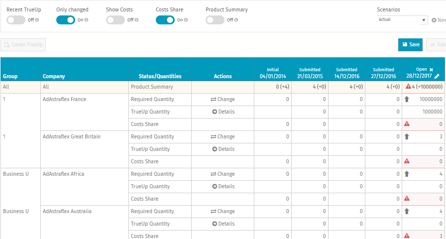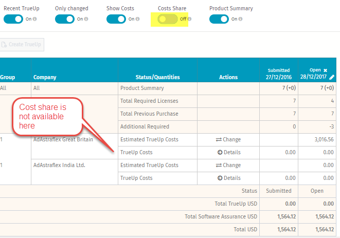 Create TrueUp: Only an Admin can create a TrueUp, which means only an Admin can open a slice. Opened slice can be used by EA Users to report usage within locations they are responsible for.