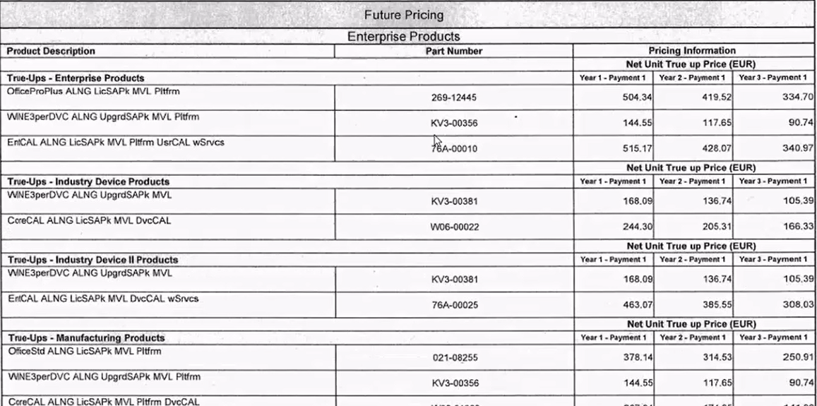 The “Future Pricing” section in CPS typically consists of multiple subsections such as “TrueUps”, “Higher Editions”, “Step-Ups”, “Future Monthly – Enterprise Online Services”, “Future Monthly – Enterprise Online Services”, etc.