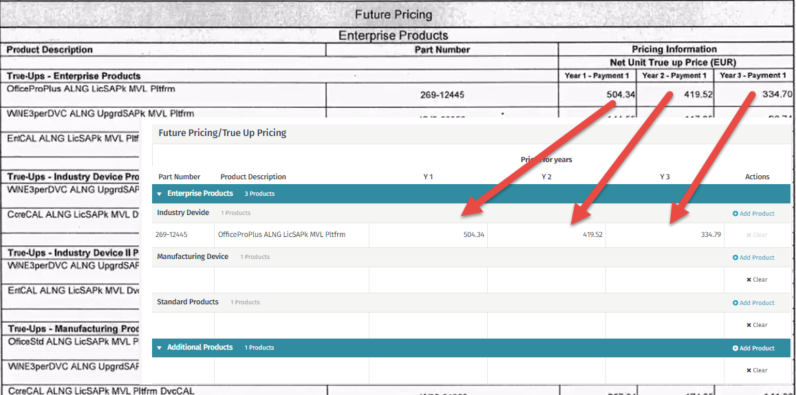 This step is to insert future pricing details that come from the “Future Pricing” section of the Customer Price Sheet. Rows in CPS represent products and columns with the right prices for the TrueUp process for that given year. The “Future Pricing” section in CPS looks similar to what is shown below: