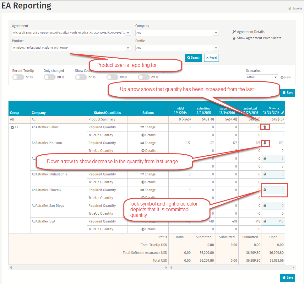 EA Admins can see the committed quantities from different companies as shown in the screenshot below: